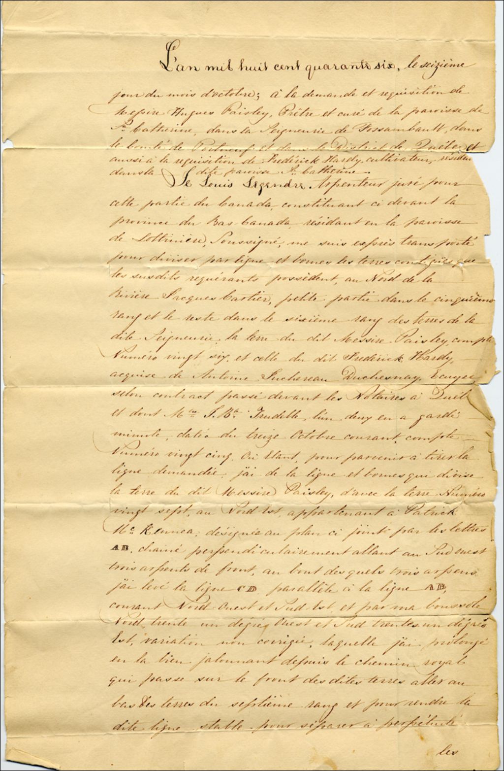 Procès-verbal d'arpentage concernant le partage des terres sur la Rivière Jacques-Cartier entre Hugh Paisley, prêtre, et Frédérick Hardy, cultivateur, résidant en la paroisse Sainte-Catherine, Seigneurie de Fossambault, signé par Louis Legendre, arpenteur juré, 16 octobre 1846, Archives nationales à Québec, Collection Pierre-Paul Côté, (03Q,P745,P43).