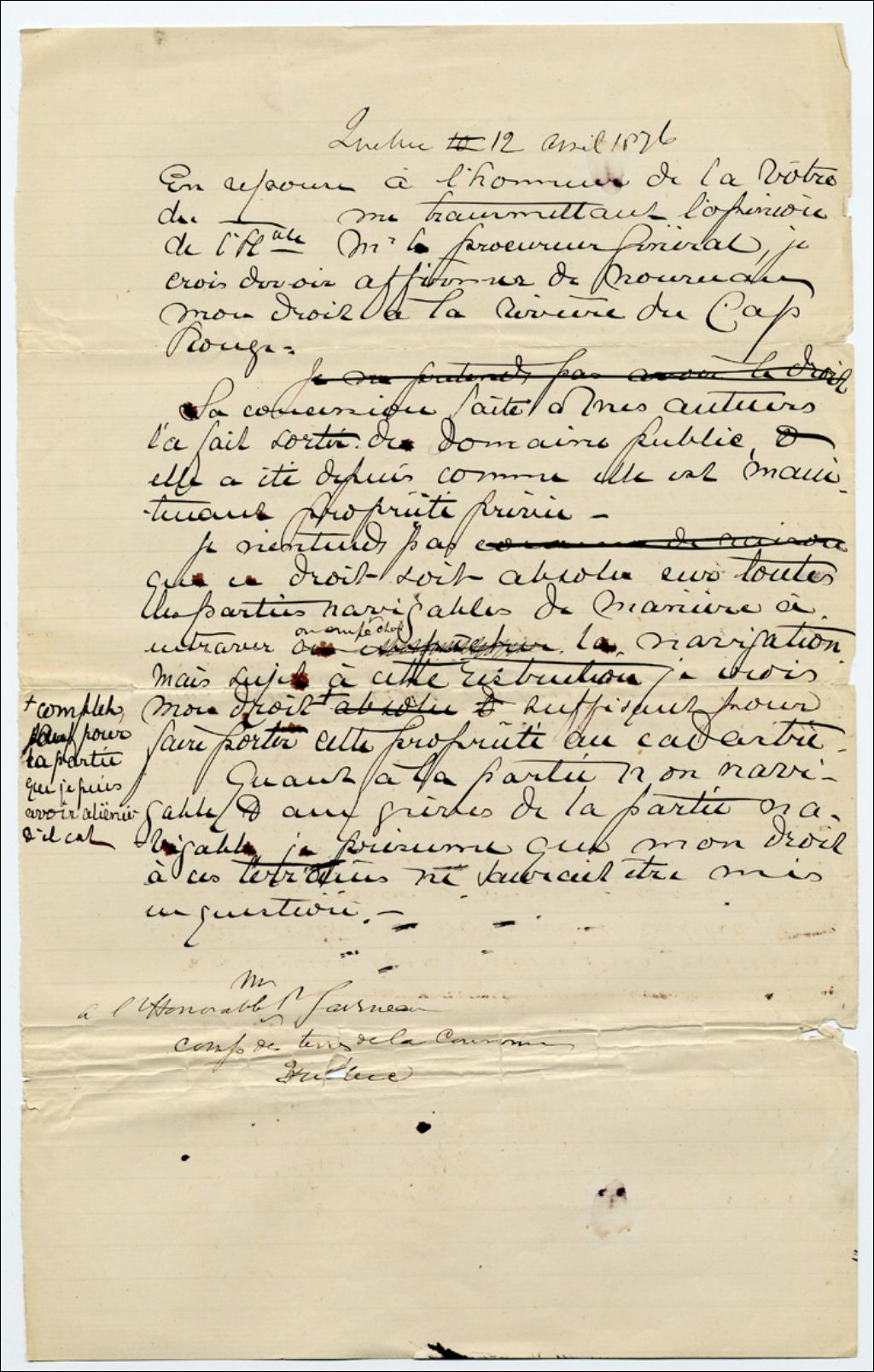 Brouillon de lettre concernant la propriété de la Rivière de Cap Rouge et des droits afférants, et son inscription au cadastre