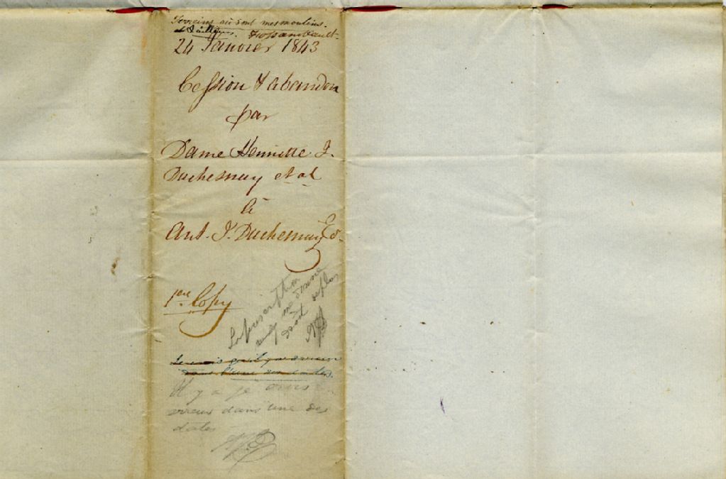 Cession par Dame Henriette Juchereau Duchesnay, Thomas Edmund Campbell, écuyer, Demoiselle Caroline Juchereau Duchesnay, à Antoine Juchereau Duchesnay, de plusieurs lopins de terre situés sur la Seigneurie de Fossambault, paroisse de Sainte-Catherine, pour avoir géré et administré gratis les affaires des dits cédants de 1738 à ce jour, signée par J. Guy, notaire, 24 janvier 1843, Archives nationales à Québec, Collection Pierre-Paul Côté, (03Q,P745,P69).