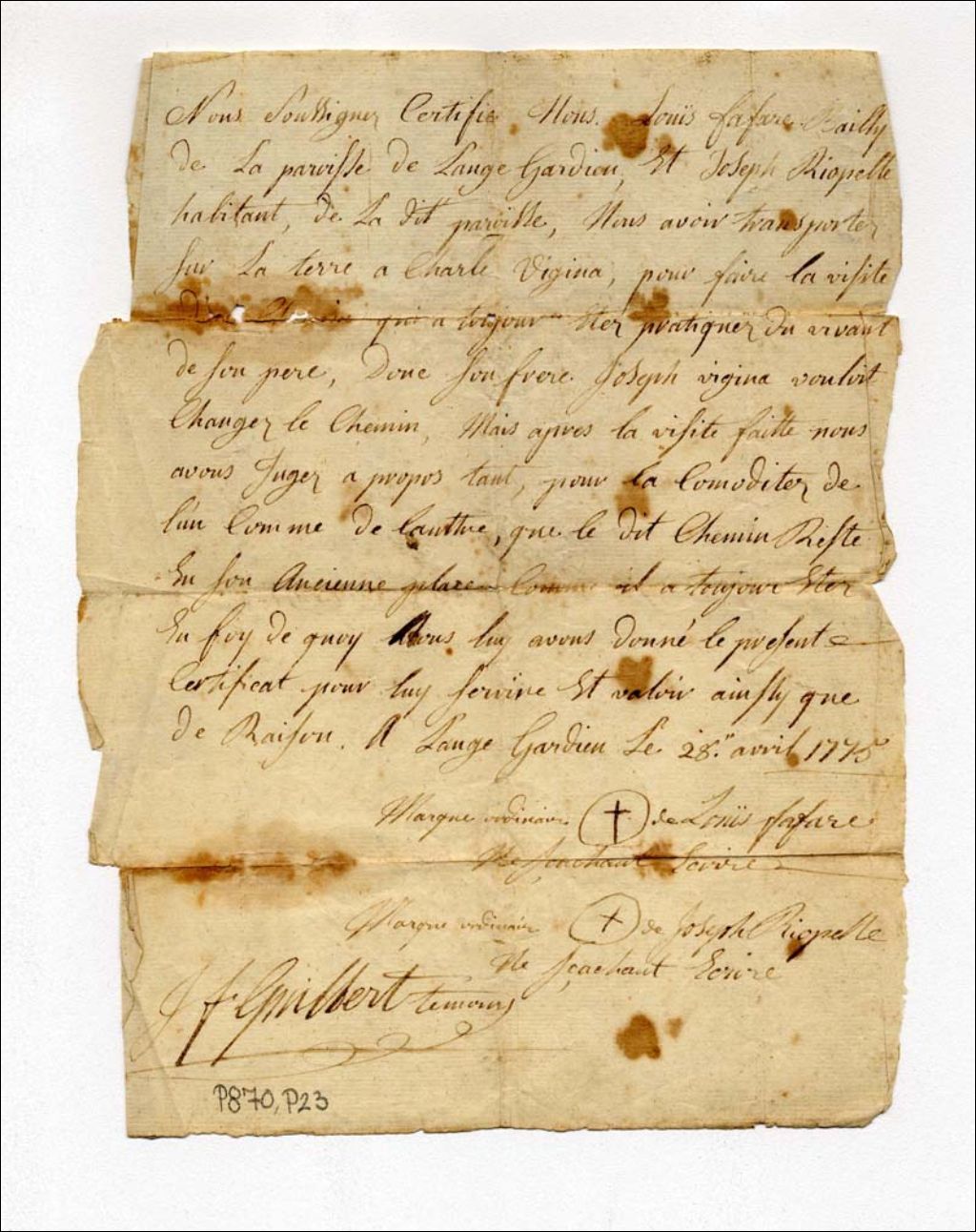 Certificat de Louis Fafare Bailly et Joseph Riopelle à l'attention de Charles Vesina concernant un chemin qui passe sur le terrain de Charles Vesina, 28 avril 1775, Archives nationales à Québec, Fonds Maison Vézina, (03Q,P870,P23).