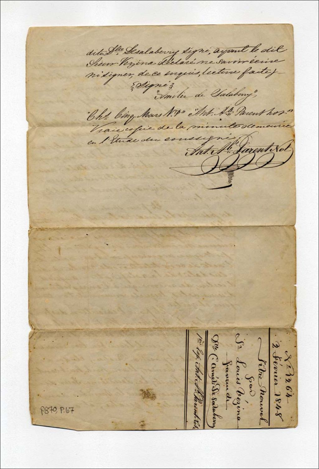 Titre nouvel par Sieur Louis Vezina en faveur de Mlle Amélie De Salaberry, 2 février 1848, Archives nationales à Québec, Fonds Maison Vézina, (03Q,P870,P67).