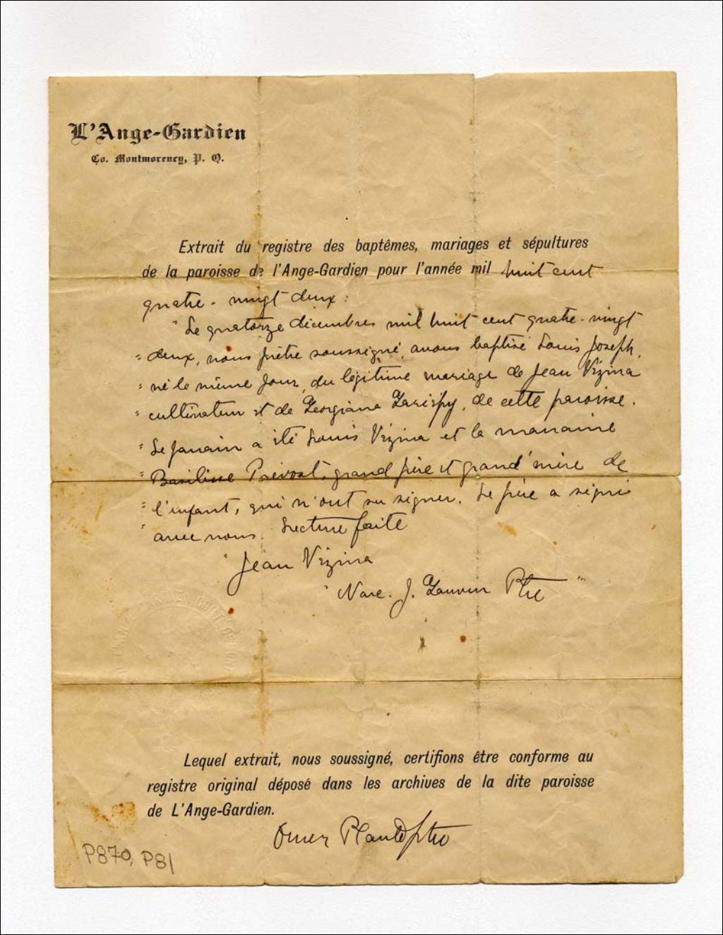 Extrait de baptême de Louis Joseph Vezina, 14 décembre 1882, Archives nationales à Québec, Fonds Maison Vézina, (03Q,P870,P81).