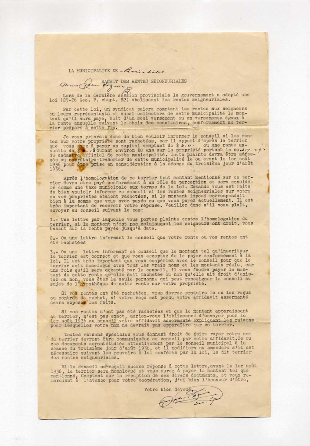 Rachat des rentes seigneuriales, 1936, Archives nationales à Québec, Fonds Maison Vézina, (03Q,P870,P87).
