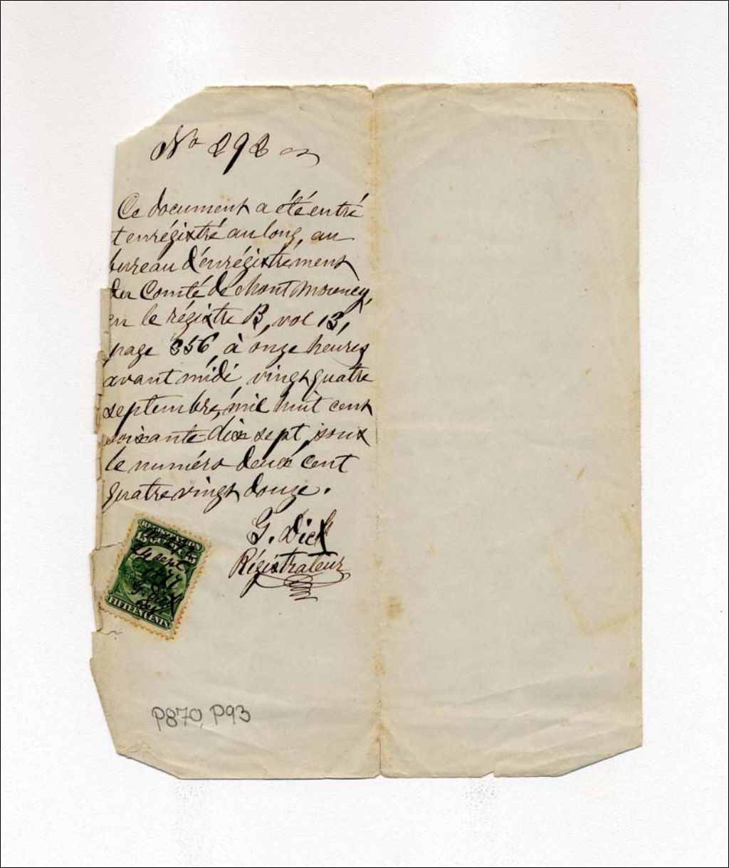 Confirmation d'enregistrement d'un document, 24 septembre 1877, Archives nationales à Québec, Fonds Maison Vézina, (03Q,P870,P93).