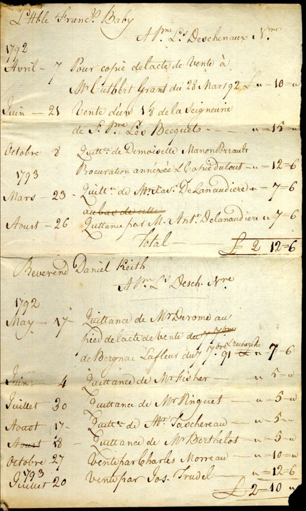 - Ce fonds se compose d'un inventaire de services notariaux rendus par Félix Têtu durant sa cléricature dans l'étude de Pierre-Louis Deschenaux (notaire à Québec de 1781 à 1794) à des personnalités en vue de Québec à la fin du XVIIIe siècle (Henry Caldwell, Charles Tarieu de Lanaudière, Pierre-Ignace-Aubert de Gaspé, Simon Fraser, etc.). Le document colligé et paraphé par Félix Têtu donne le détail des minutes, leurs dates (9 avril 1788 au 22 octobre 1794), le coût de chaque acte et leurs totaux pour chaque client
