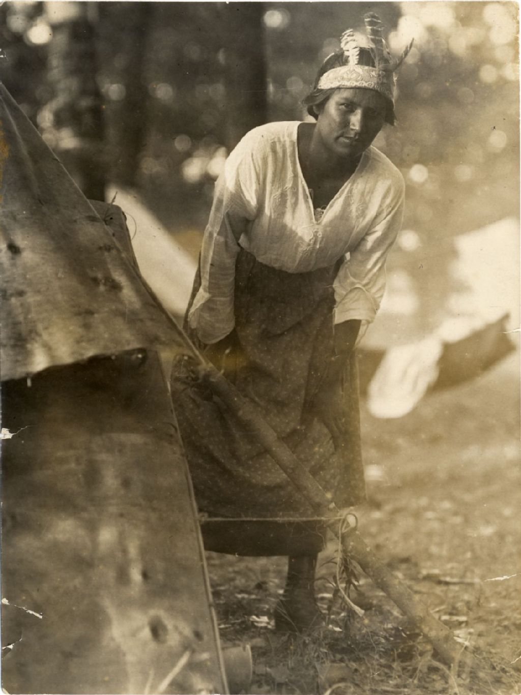 Femme amérindienne se tenant près d’un tipi
