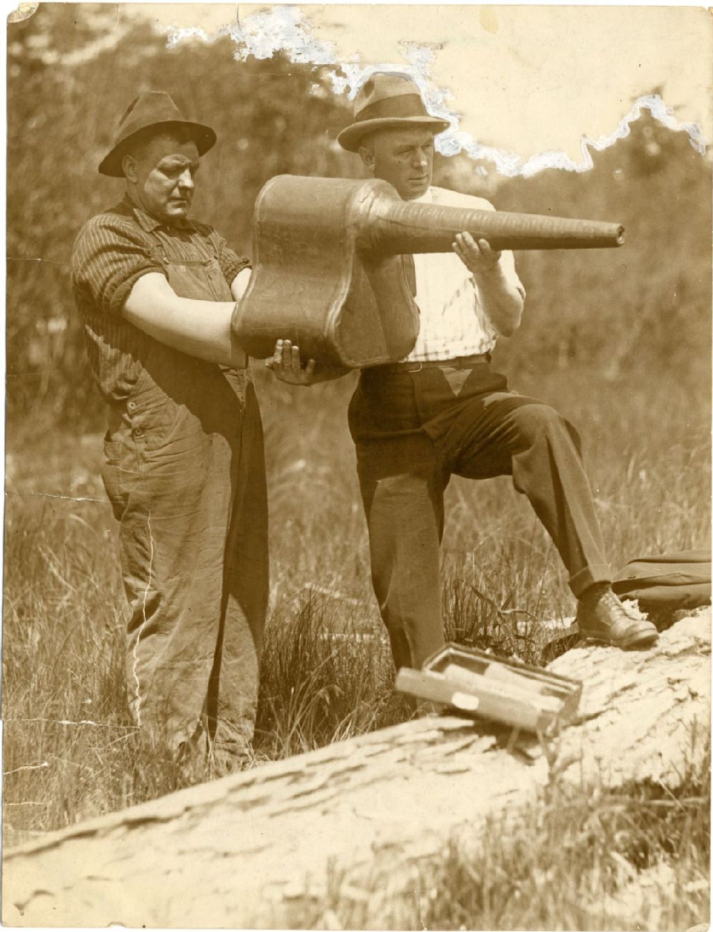 Deux hommes tenant un appareil inconnu, [Vers 1920], Archives nationales à Québec, Collection Julienne Sioui, (03Q,P907,P44), Photographe non identifié.