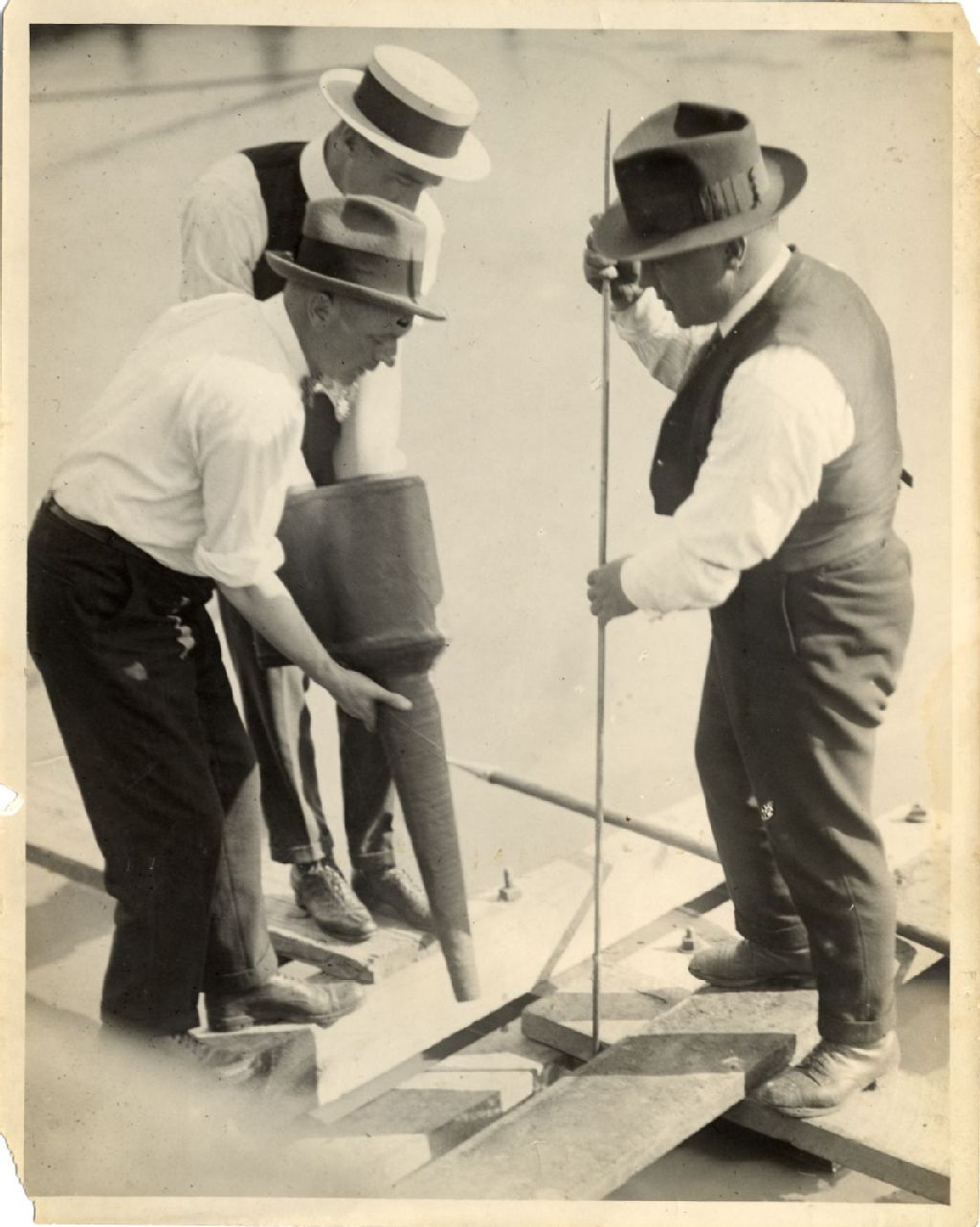Trois hommes travaillant sur un quai avec un appareil nommé le « driving road? »