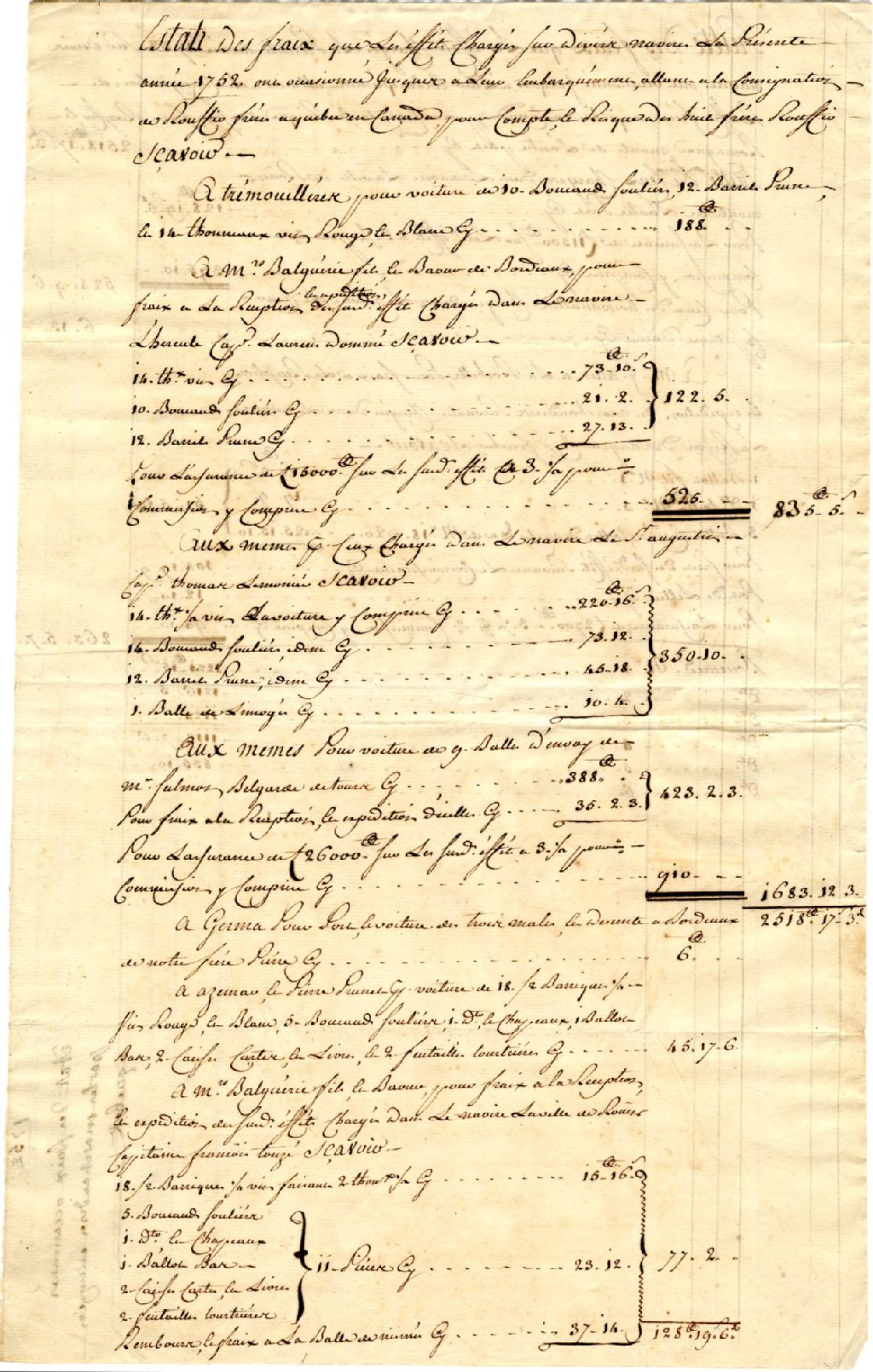 État des frais pour l'embarquement des marchandises, 1752, Archives nationales à Québec, Fonds Société des frères Rouffio, (03Q,P908,P6).