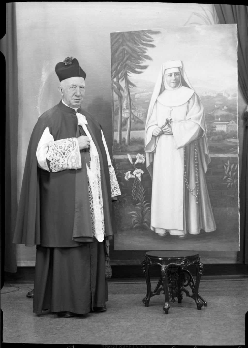 Tableau représentant "Marie Bertille de l'Eucharistie", oeuvre de Sr St-Vienney, près du tableau le frère de Sr Marie Bertille Mgr Joseph-Arthur Gauthier