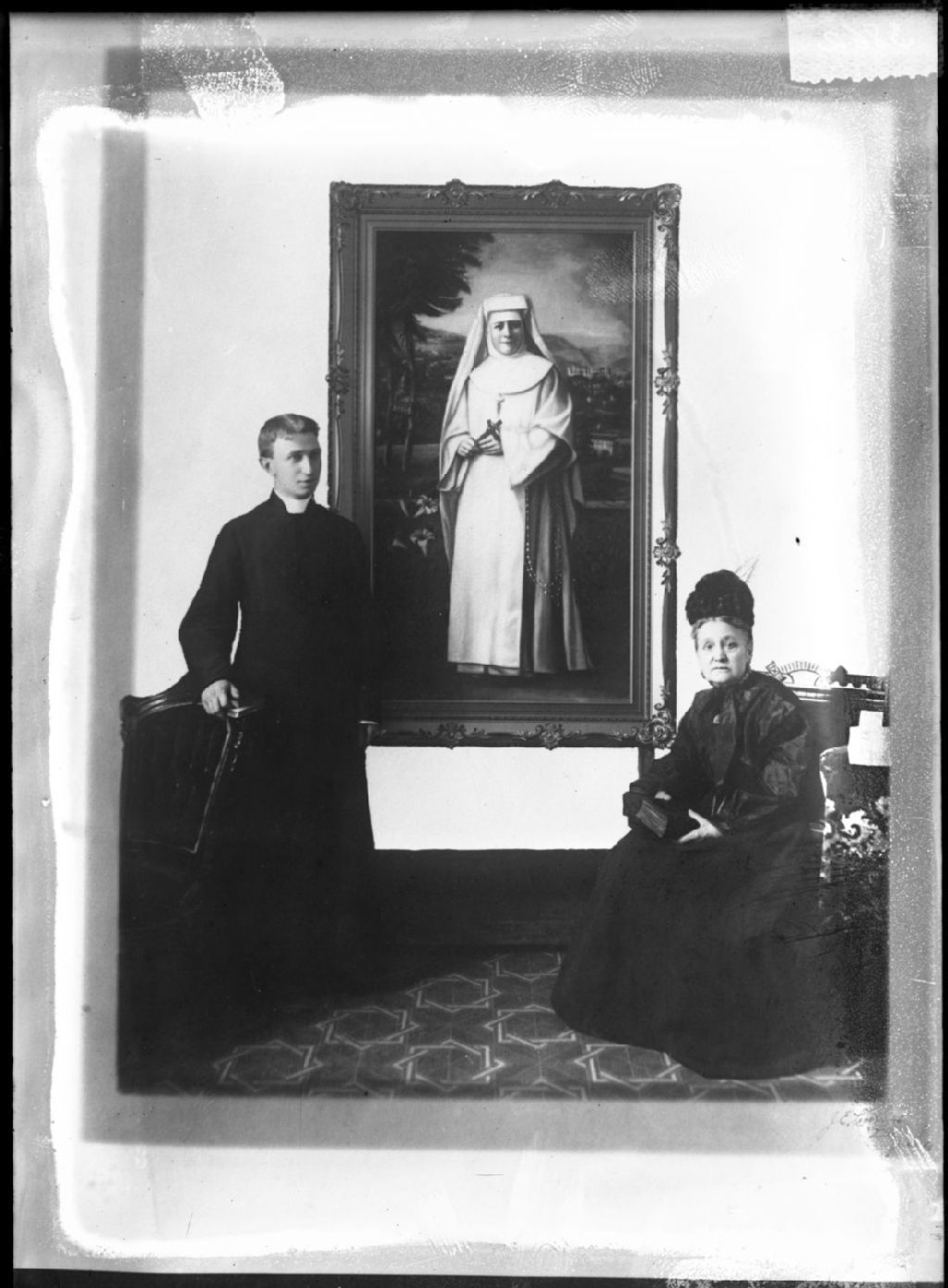 Reproduction photographique de l'abbé Joseph-Arthur Gauthier et sa tante madame Joseph Martineau (née Sophie Dion) devant le tableau représentant sa s¿ur religieuse [Sr Marie Bertille de l'Eucharistie, oeuvre de Sr Marie-de-l'Eucharistie]