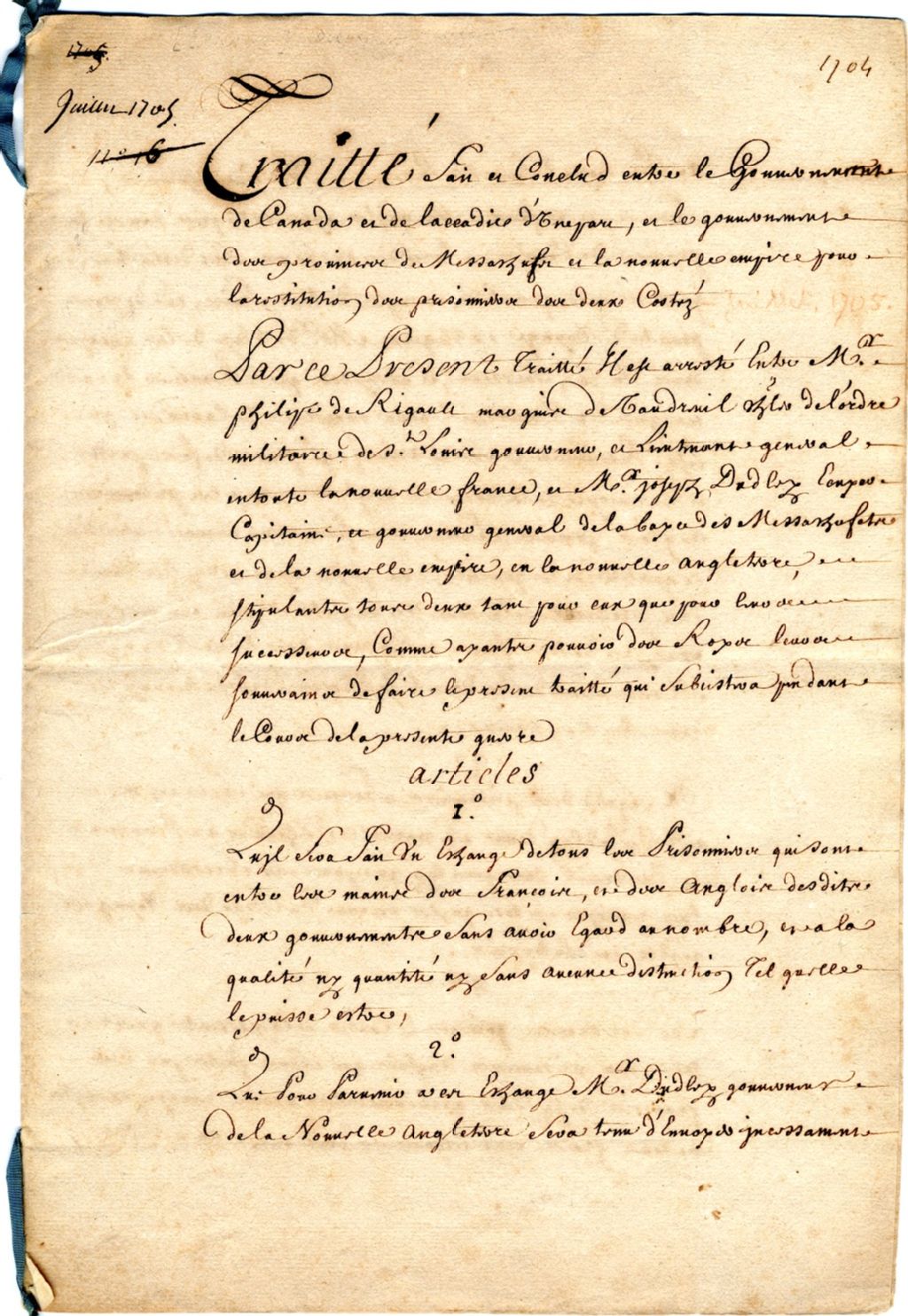 Fonds Traité fait et conclu pour l'échange de prisonniers entre Philippe de Rigaud de Vaudreuil et Joseph Dudley, Juillet 1705, Archives nationales à Québec, Fonds Traité fait et conclu pour l'échange de prisonniers entre Philippe de Rigaud de Vaudreuil et Joseph Dudley, (03Q,P919).