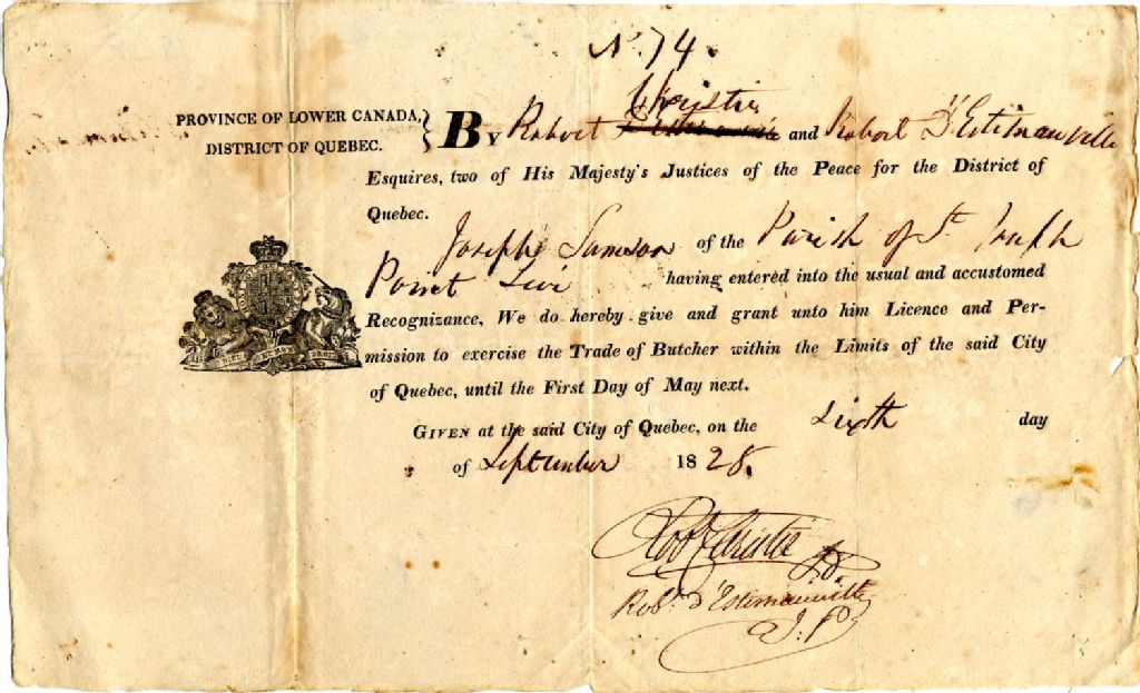 Licence and permission to exercise the Trade of Butcher to Joseph Samson, 1828, Archives nationales à Québec, Fonds Famille Gabriel Samson, (03Q,P923,D14,P1).