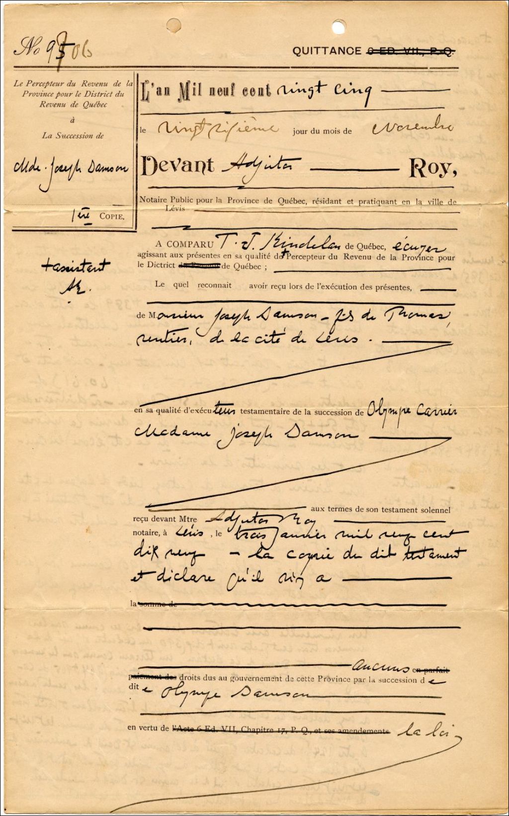 - Quittance par Le Percepteur du Revenu de la province pour le district de Québec à la succession de Joseph Samson