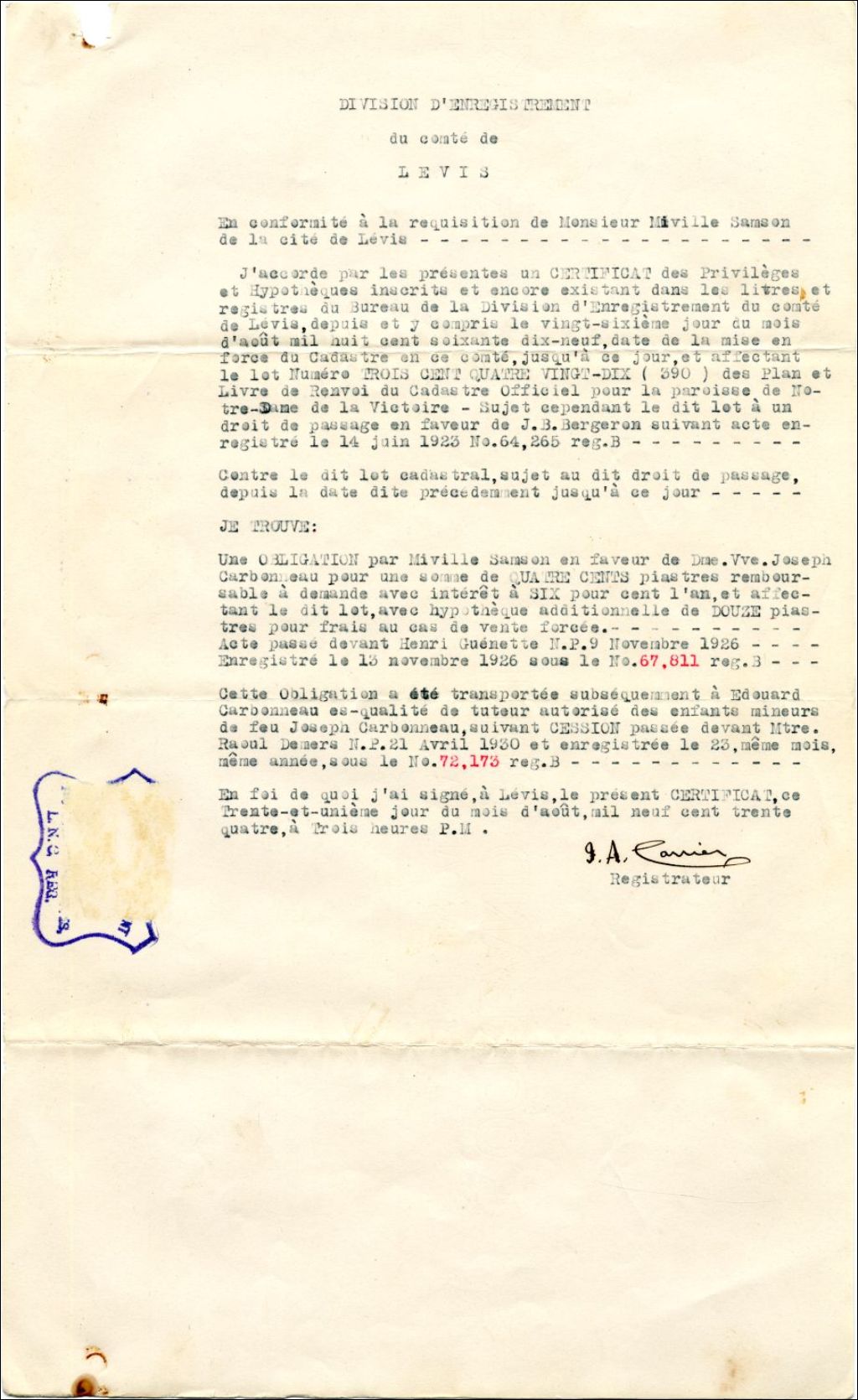 Demande de certificat des privilèges et hypothèques par Miville Samson pour certains lots de terre, 1934, Archives nationales à Québec, Fonds Famille Gabriel Samson, (03Q,P923,D20,P11).