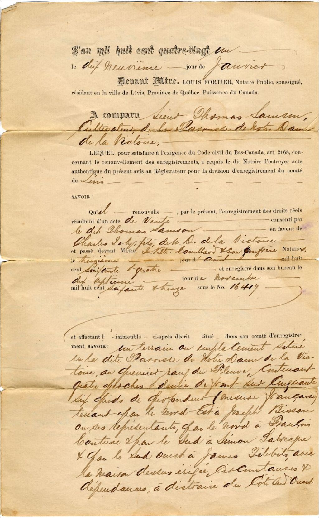 Avis de renouvellement d'enregistrement d'une rente foncière par Marie Nolin en faveur de Thomas Samson, 1881, Archives nationales à Québec, Fonds Famille Gabriel Samson, (03Q,P923,D20,P2).