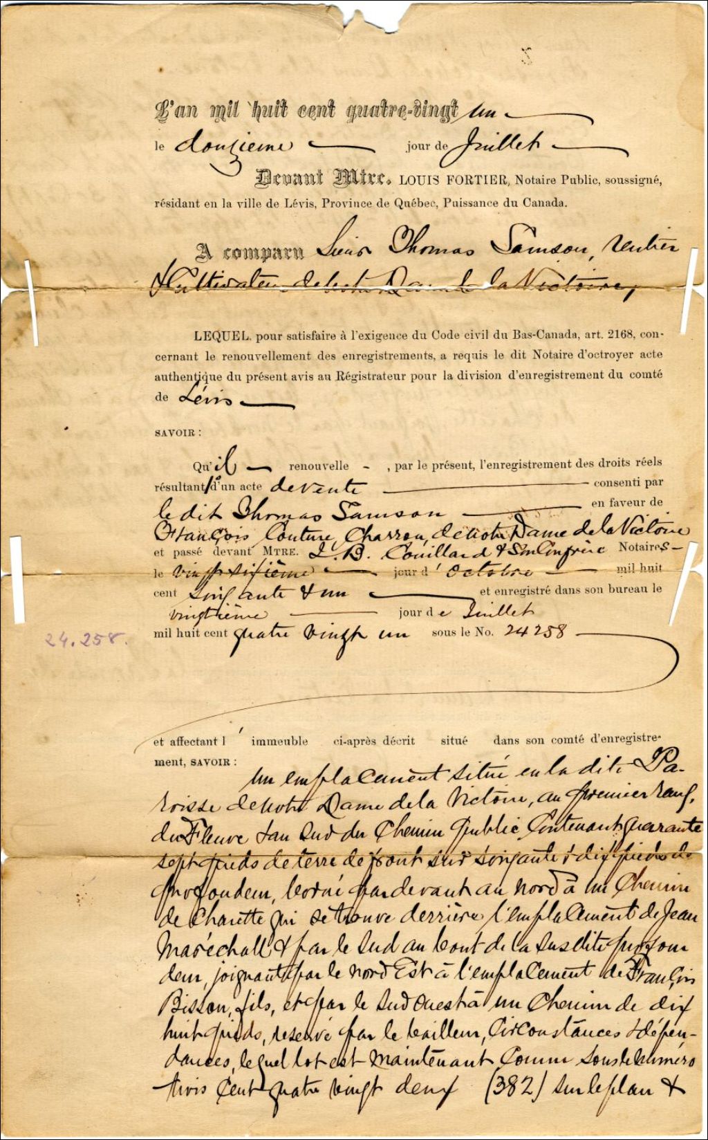 Avis de renouvellement d'enregistrement de 2 actes de vente consentis à Thomas Samson et C. Alleyn en faveur de François Couture, 1881, Archives nationales à Québec, Fonds Famille Gabriel Samson, (03Q,P923,D20,P3).
