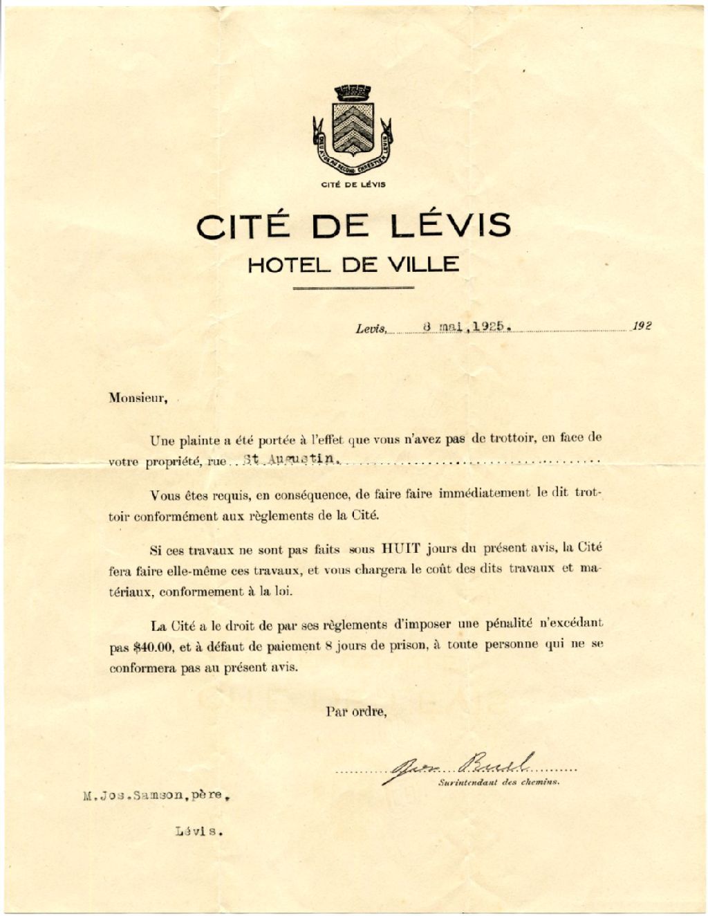 Avis à Joseph Samson père de l'Hôtel de ville de la cité de Lévis