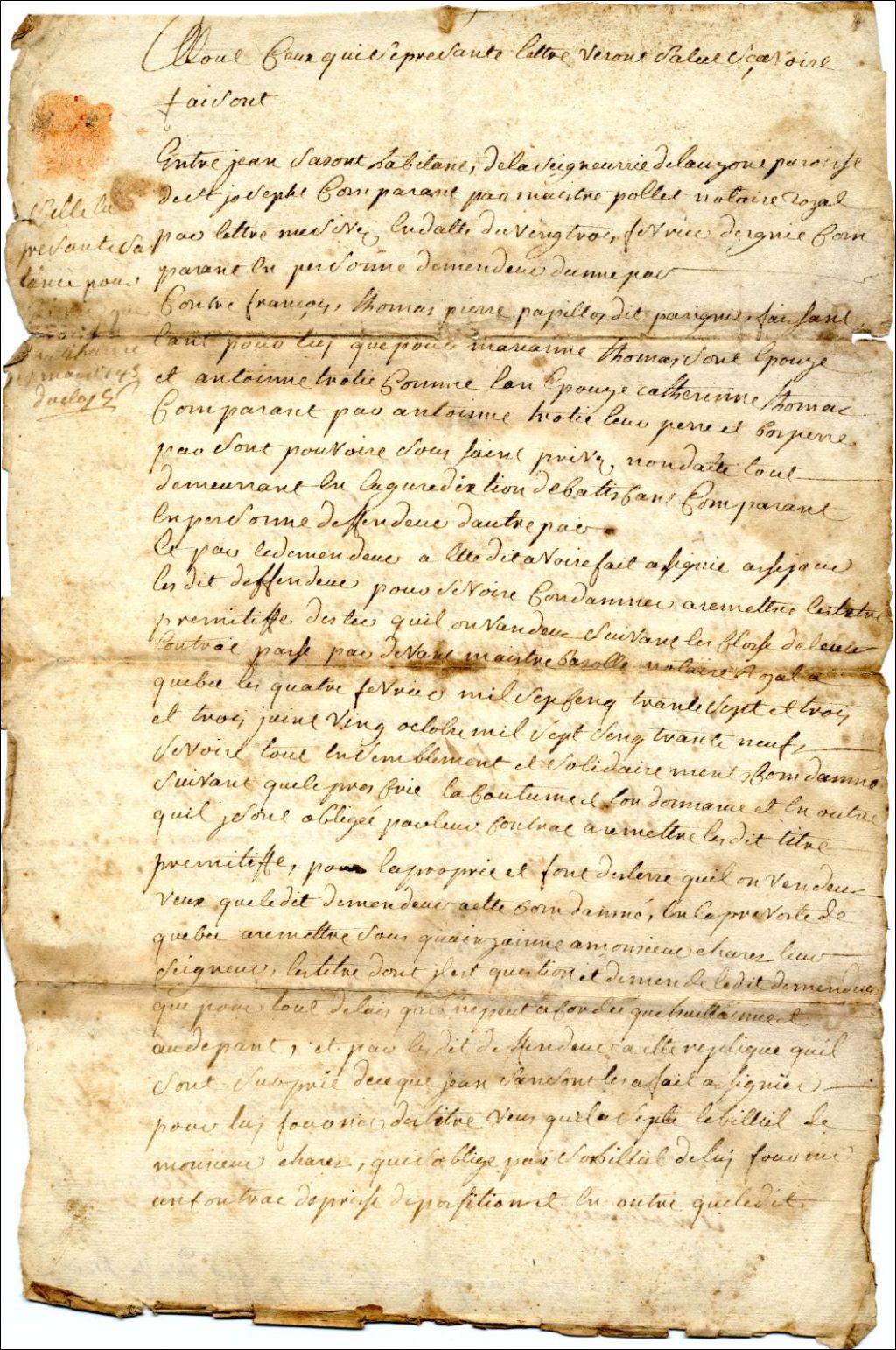Demande de titre de propriété par Jean Samson, 1745, Archives nationales à Québec, Fonds Famille Gabriel Samson, (03Q,P923,D30,P1).