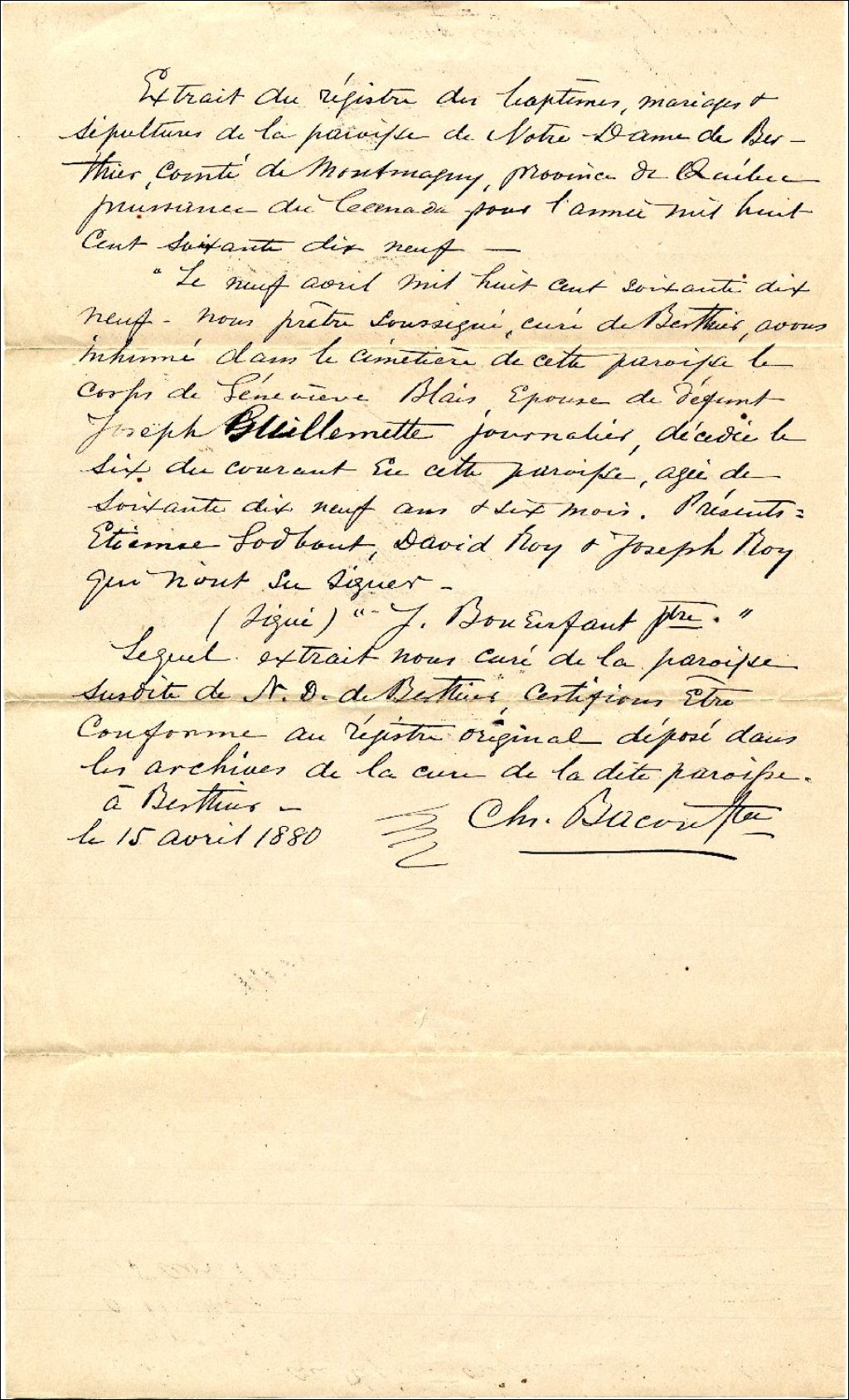 Extrait du registre des baptêmes, mariages et sépultures de la paroisse de Notre-Dame de Berthier, de l'acte de sépulture de Geneviève Blais, 15 avril 1880, Archives nationales à Québec, Fonds Famille Pierre Blais, (03Q,P940,D114).