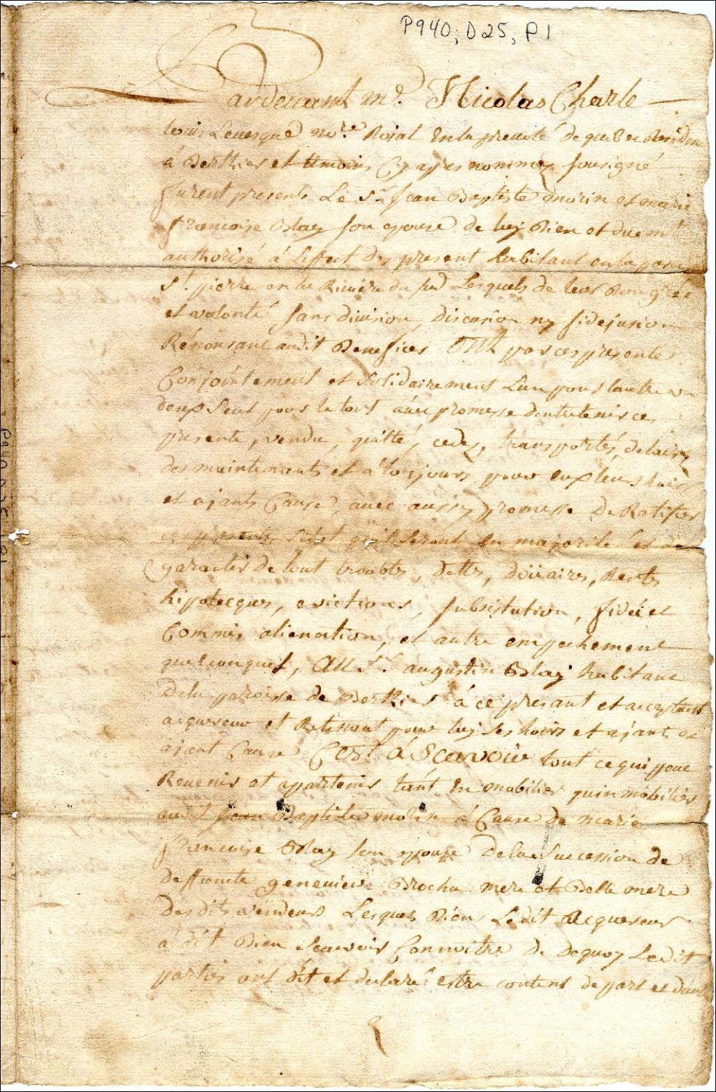 Vente par Jean Baptiste Morin, Françoise Blay, son épouse à Augustin Blay, devant le notaire Nicolas Charles Louis Lévesque, 15 juillet 1753, Archives nationales à Québec, Fonds Famille Pierre Blais, (03Q,P940,D25).