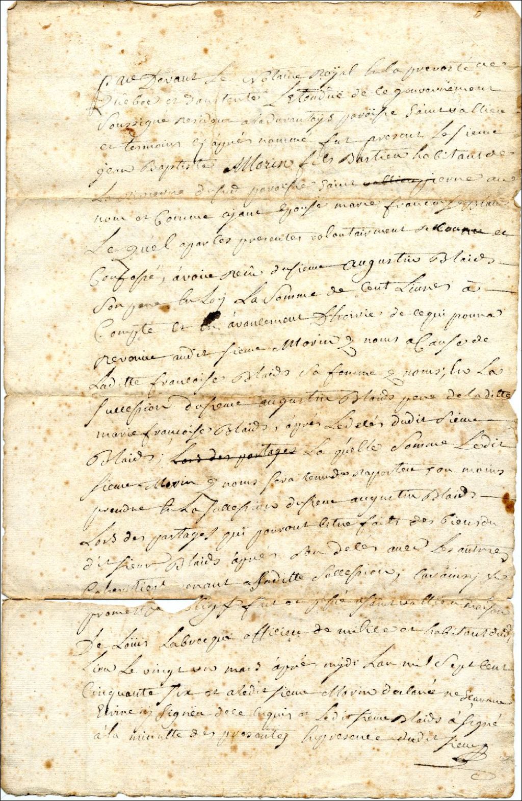 Reçu de Jean Baptiste Morin devant le notaire Nicolas Charles Louis Lévesque, 21 mars 1756, Archives nationales à Québec, Fonds Famille Pierre Blais, (03Q,P940,D27).