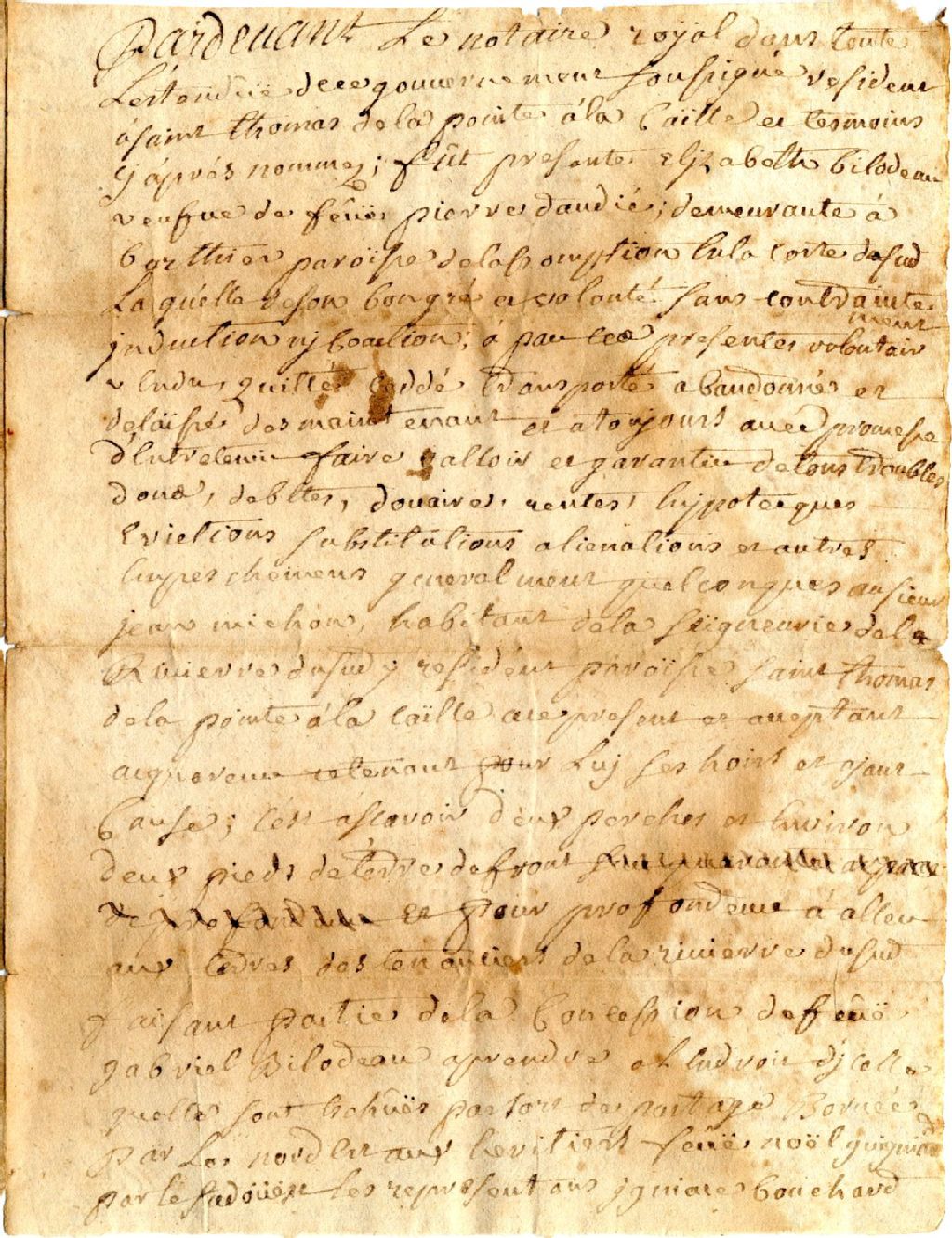 Vente de terre par Elisabeth Bilodeau, veuve de Pierre Daudié à Jean Michon, devant le notaire Nicolas Charles Louis Lévesque, 2 août 1774, Archives nationales à Québec, Fonds Famille Pierre Blais, (03Q,P940,D37).