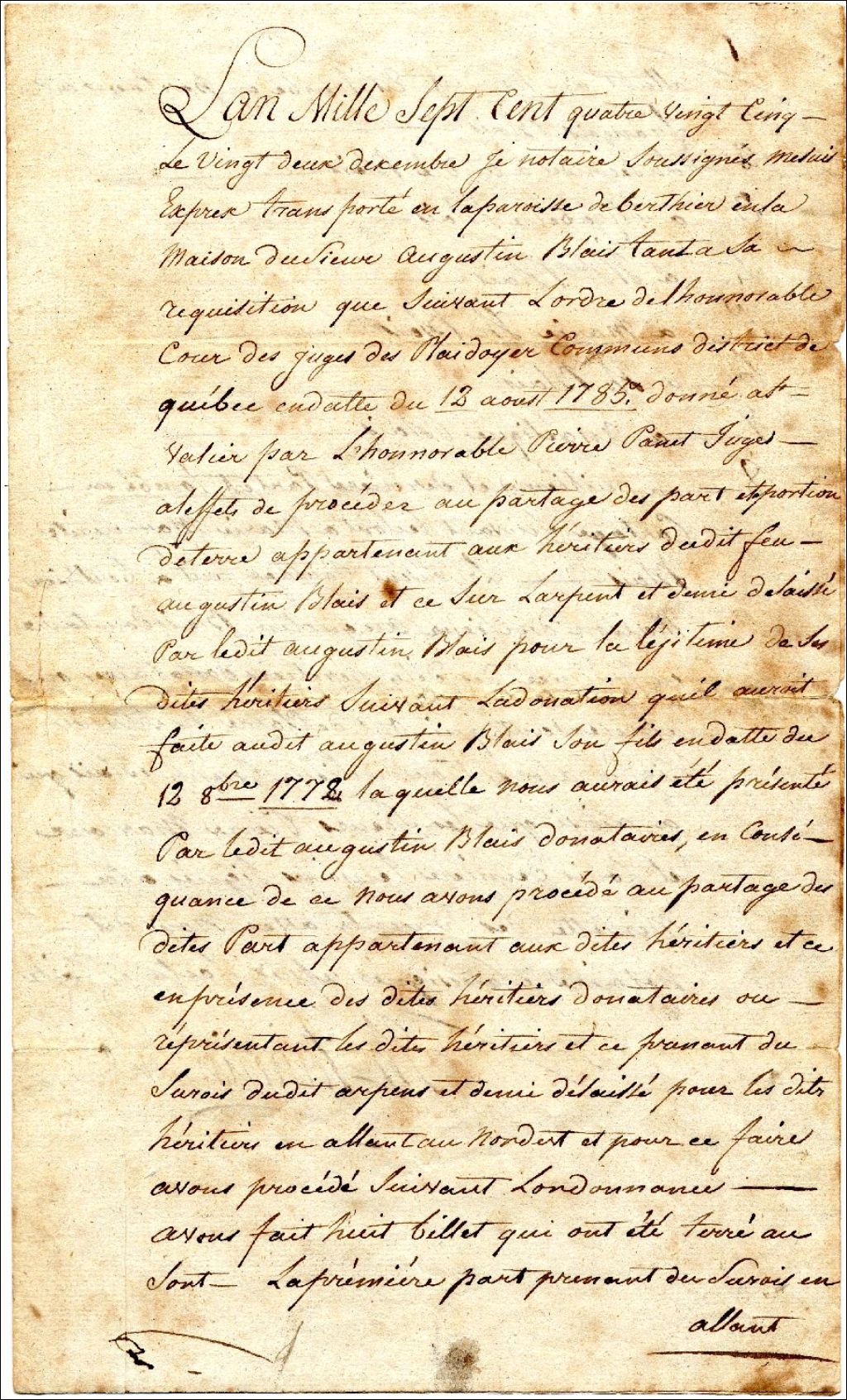 Partage fait entre les héritiers de feu Augustin Blais, devant le notaire Joseph Riverin, 22 décembre 1785, Archives nationales à Québec, Fonds Famille Pierre Blais, (03Q,P940,D38).