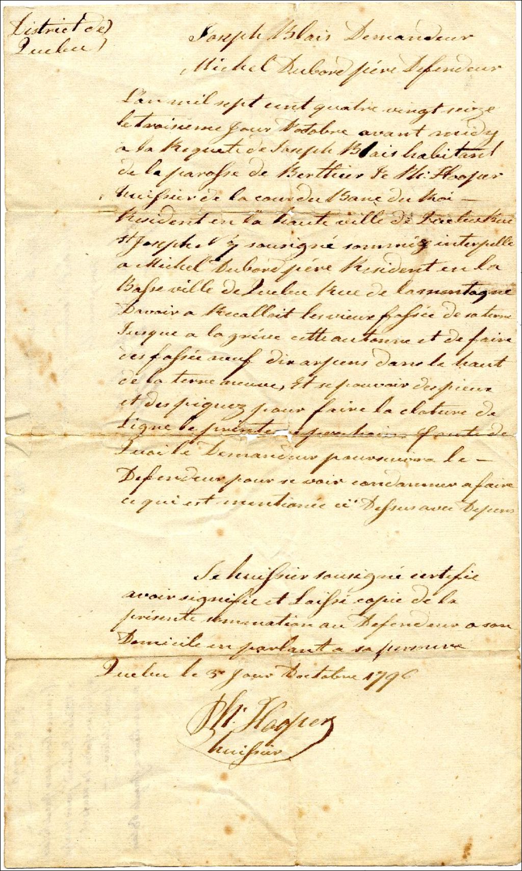 Cour du banc du roi du district Québec : sommation par Joseph Blais à Michel Dubord, père, 3 octobre 1796, Archives nationales à Québec, Fonds Famille Pierre Blais, (03Q,P940,D41).