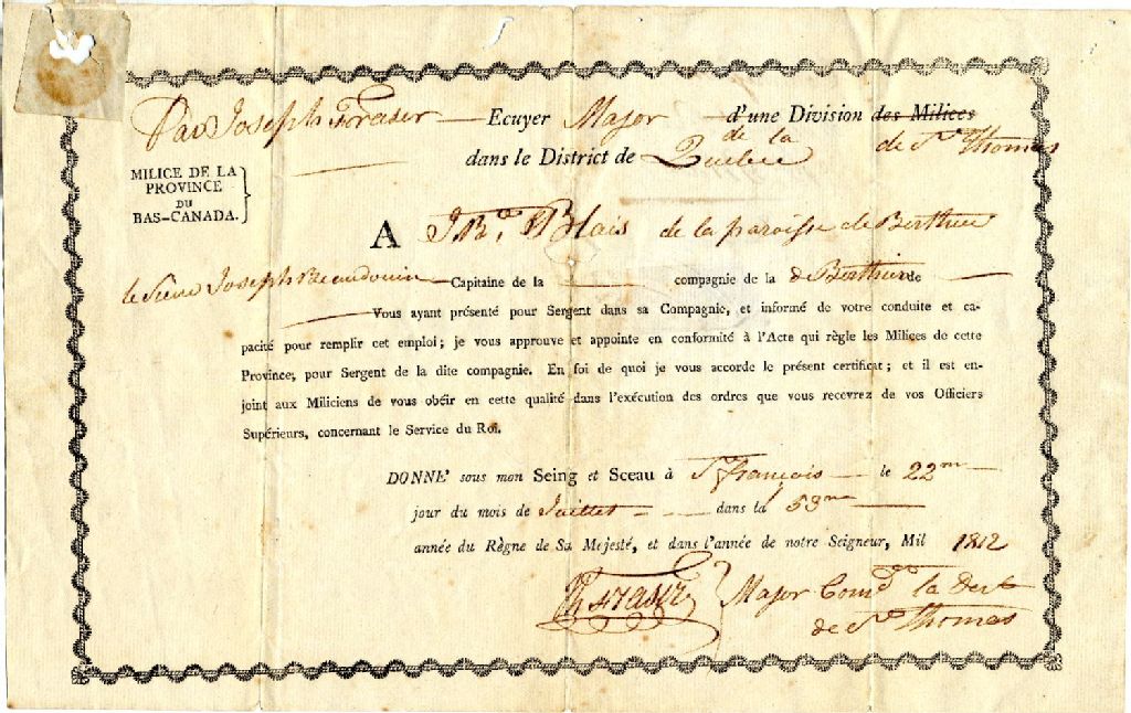 Commission de sergent pour Jean Baptiste Blais par Joseph Fraser, écuyer major, comté de Saint-Thomas, district de Québec, 22 juillet 1812, Archives nationales à Québec, Fonds Famille Pierre Blais, (03Q,P940,D59).