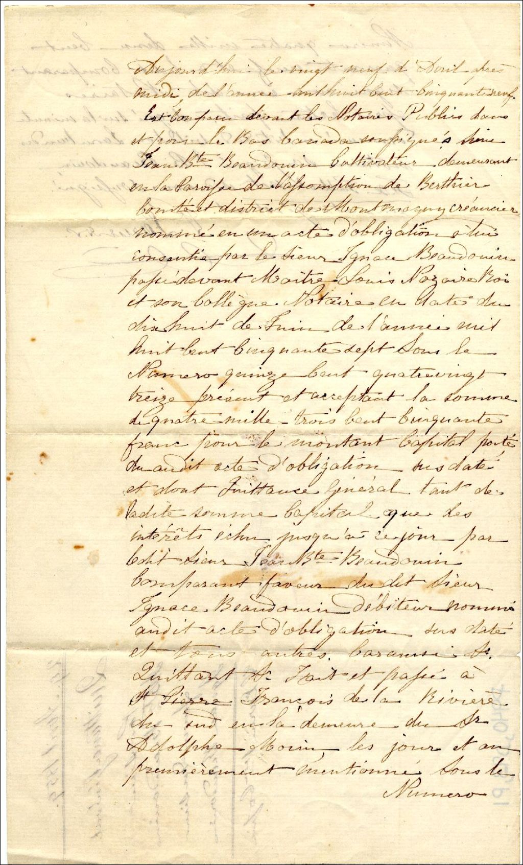 Quittance générale par Jean Baptiste Beaudouin en faveur de Ignace Beaudoin, devant le notaire Vildebon Larue, 29 avril 1858, Archives nationales à Québec, Fonds Famille Pierre Blais, (03Q,P940,D93).