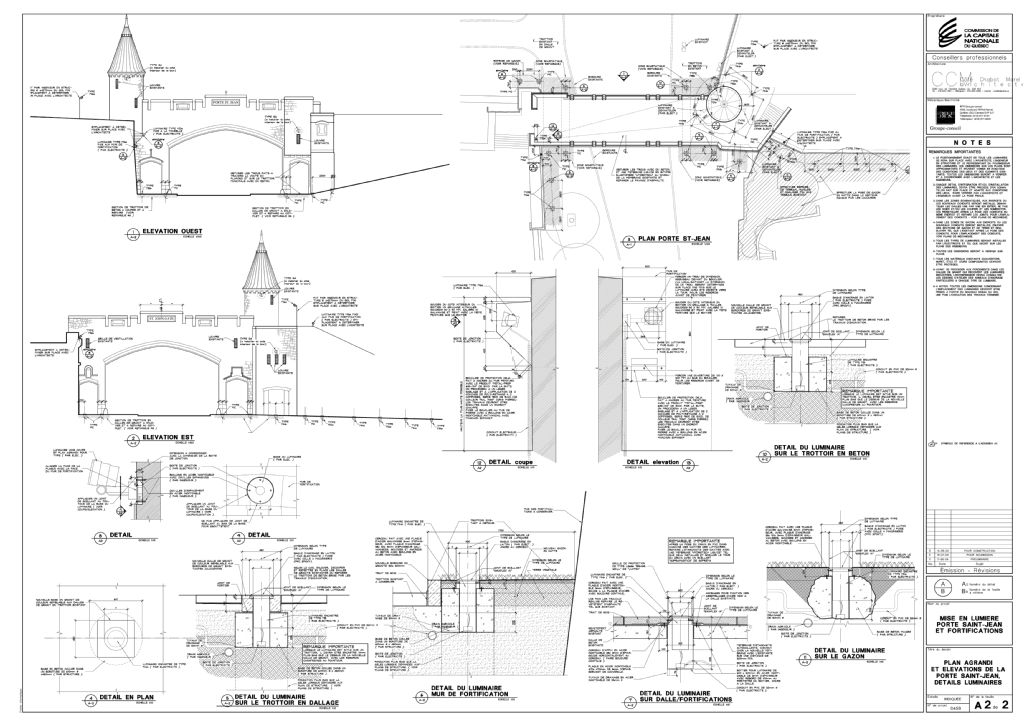 - Ce dossier témoigne du projet de mise en lumière de la Porte Saint-Jean et des fortifications situées dans le Vieux-Québec. Le dossier comprend des dessins d'architecture