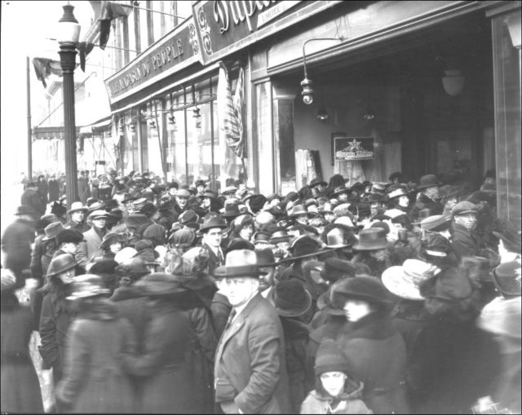 Magasin Dupuis Frères. Foule rassemblée pour profiter des rabais du 53e anniversaire, Mars 1921, Archives nationales à Montréal, Collection Scènes de rues de Montréal, (06M,P20,S3,P58), Photographe non identifié.