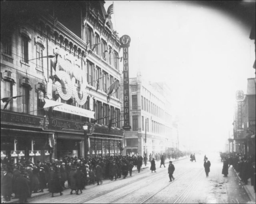 Magasin Dupuis Frères. Foule rassemblée pour profiter des rabais du 53e anniversaire, Mars 1921, Archives nationales à Montréal, Collection Scènes de rues de Montréal, (06M,P20,S3,P59), Photographe non identifié.