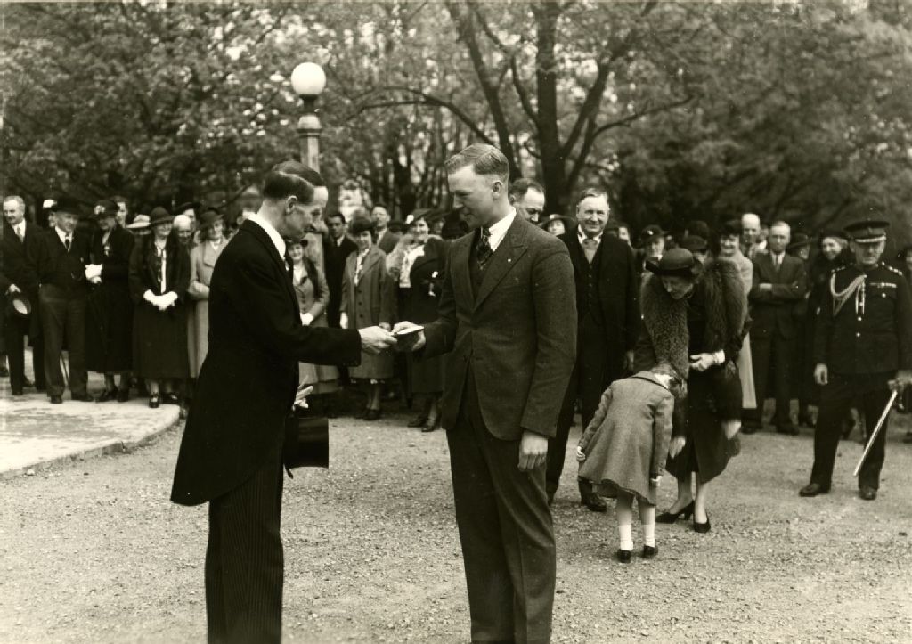 Lord John Buchan Tweedsmuir (1875-1940), gouverneur général du Canada (1935-1940), décernant la médaille du gouverneur général à un jeune homme pour son travail compétent à l'O.A.C, 1937, Archives nationales à Montréal, Collection Charles Robert William Gordonsmith, (06M,P32,S4,P120), Photographe non identifié.