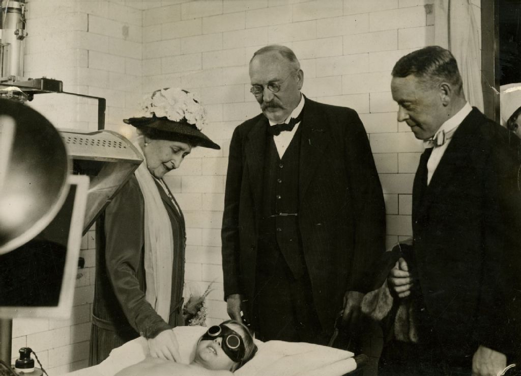 La princesse Louise "marquise de Lorne" (1848-1939), le docteur Murray Luick et monsieur Campbell Johnstone lors d'une visite à l'association humaine britannique "Sun Cure Home", s'adressant à une jeune patiente, 1925, Archives nationales à Montréal, Collection Charles Robert William Gordonsmith, (06M,P32,S4,P31), Photographe non identifié.
