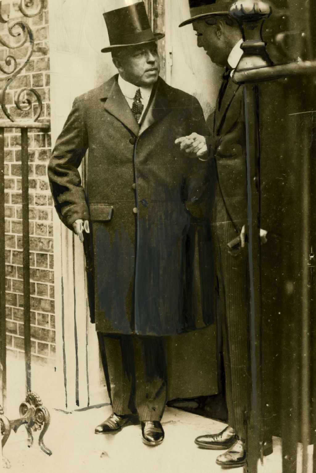 L'honorable William Lyon Mackenzie King (1874-1950), Premier ministre du Canada (1921-1930 et 1935-1948), causant avec un homme (non-identifié) après la conférence impériale à Londres