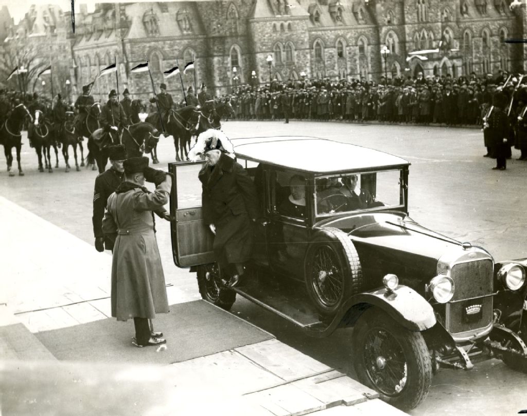 Le vicomte Freeman Thomas Willingdon (1866-1941), gouverneur général du Canada (1926-1931), descendant d'une voiture en face du Parlement d'Ottawa