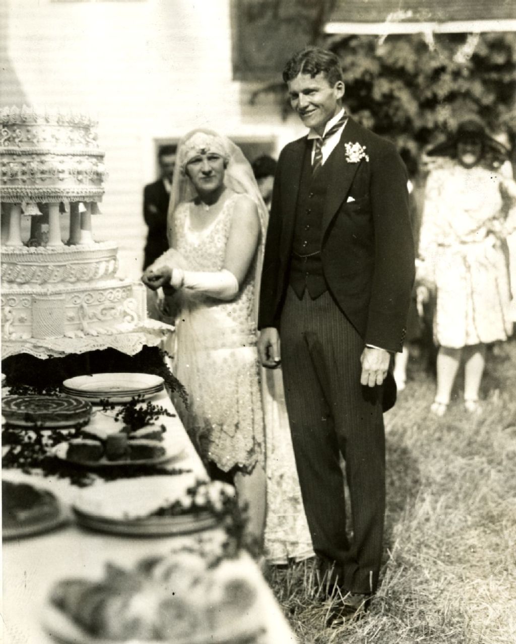 Lena Wilson et Bud Stillman, le jour de leur mariage à Grande-Anse (Québec), coupant leur gâteau de noces