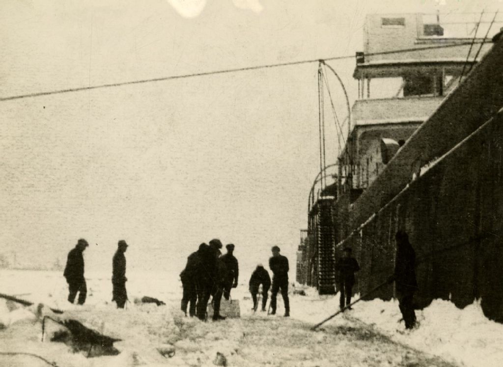 Navire venu des Grands Lacs, pris dans la glace à Montréal. Son équipage tente de couper la glace qui lui bloque le passage