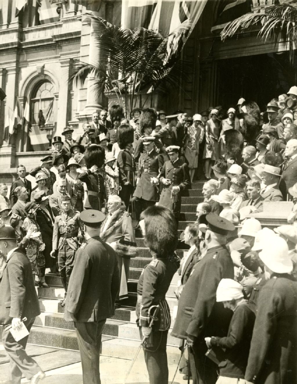 Les princes britanniques accueillis à l'Hôtel de ville de Montréal. Au centre de l'escalier, le Prince George, dans les dernières marches, le prince de Galles (futur roi Édouard VIII) et à sa droite le maire de Montréal, Médéric Martin