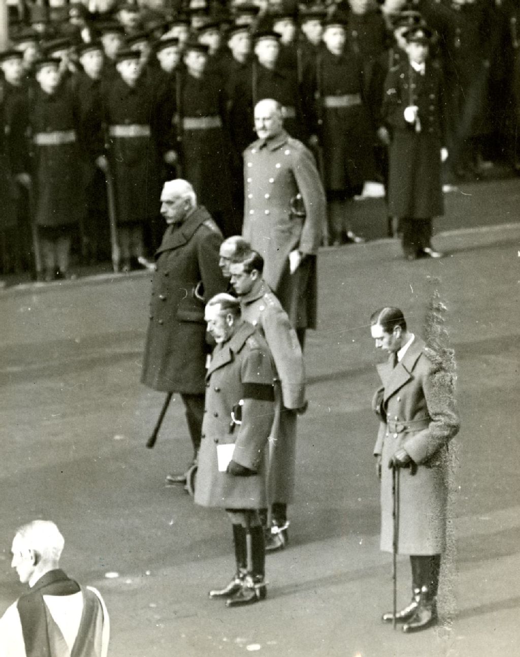 Au centre à l'avant, le roi George V, un livre à la main. À sa droite à l'arrière, le prince George et à sa gauche, le prince de Galles (futur roi Édouard VIII) à Londres lors du 9e anniversaire de l'Armistice au Cénotaphe