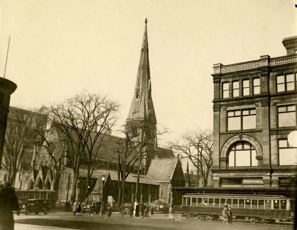 La Cathédrale Christ Church, église-mère du diocèse anglican de Montréal, au nord de la rue Sainte-Catherine entre les rues Union et Université. À droite, une partie de la devanture du grand magasin Morgan et un tramway