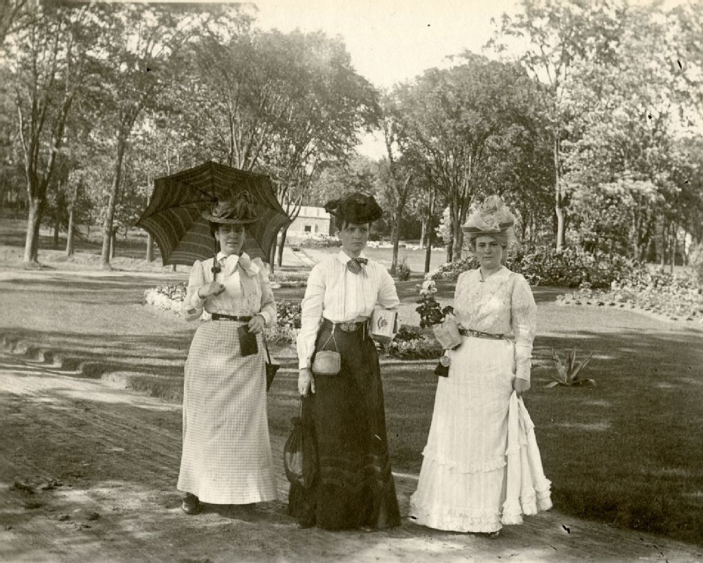 Deux dames non-identifiées et Maria Clément à l'entrée du cimetière de la Côte-des-Neiges à Montréal, 28 juillet 1902, Archives nationales à Montréal, Fonds Béatrice Clément, (06M,P43,S4,P203), Clément, Béatrice.