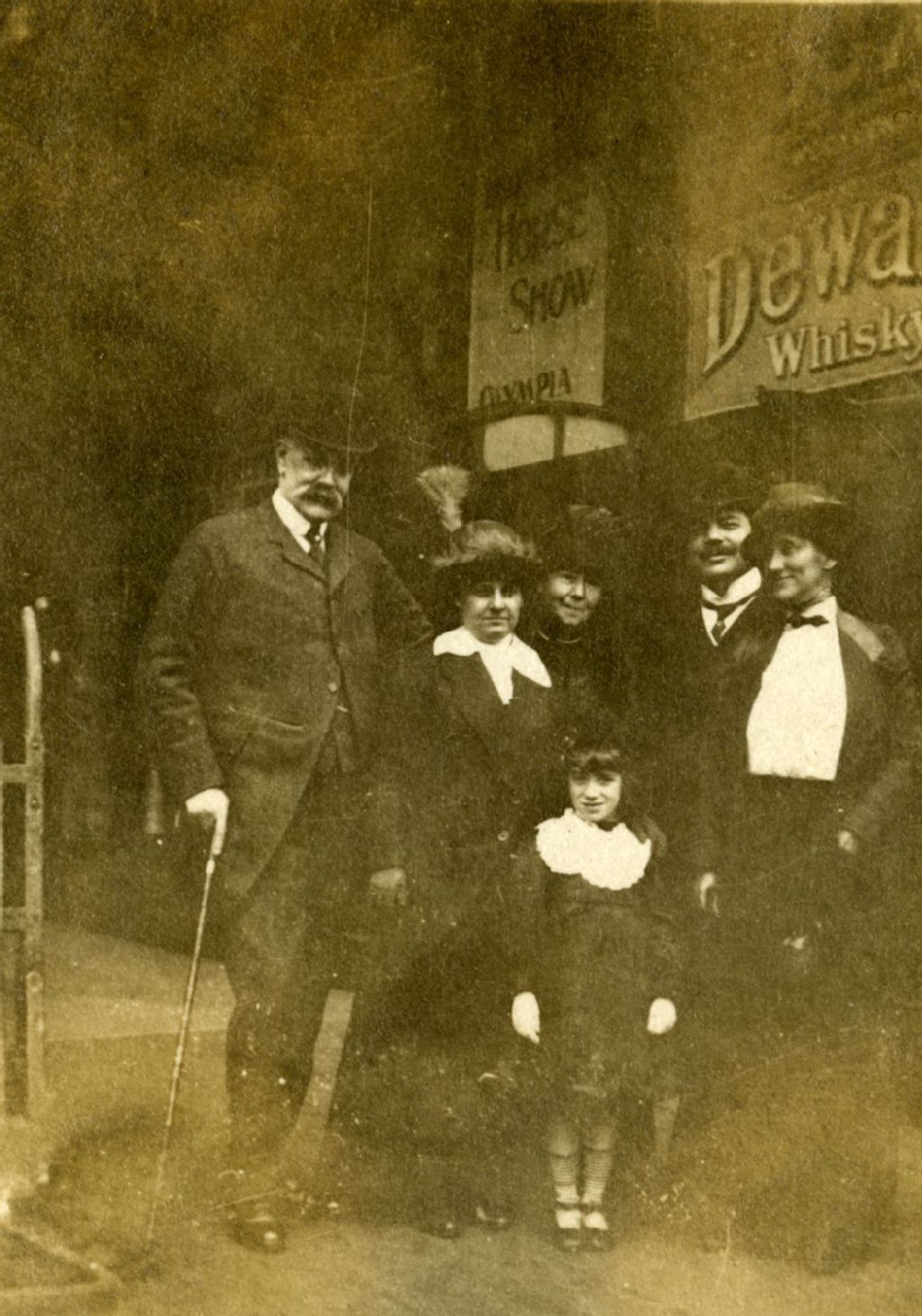 Béatrice Clément avec ses parents et de leurs amis dans une gare de Londres (Angleterre)