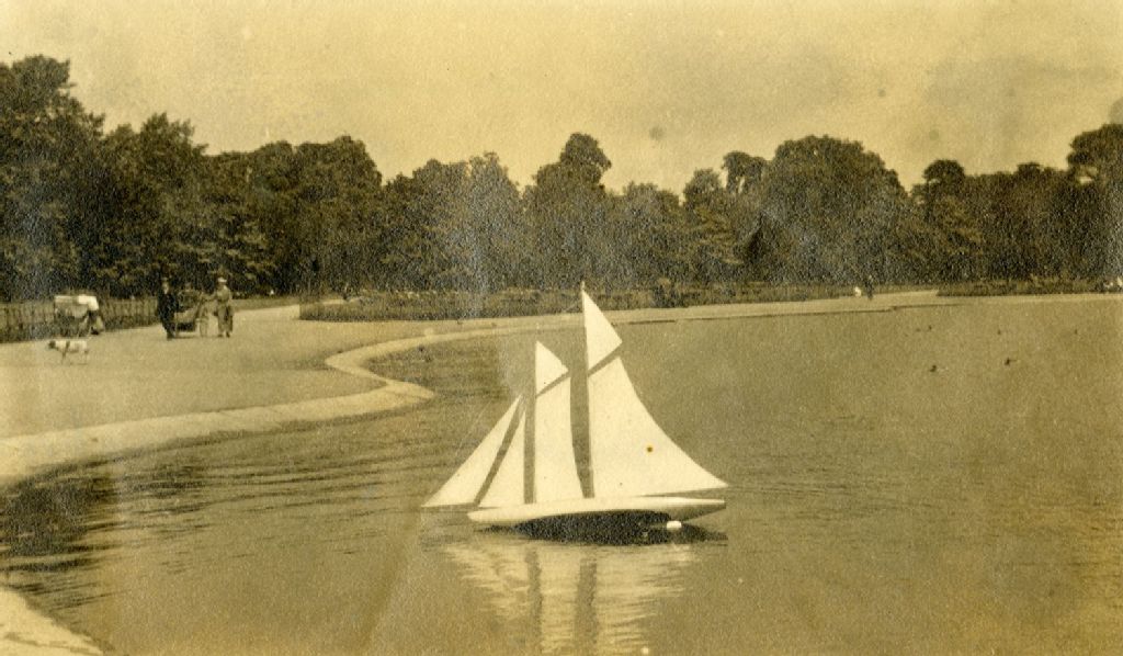Voilier miniature de Marcel Clément, membre du Model Yacht Sailing Association sur le Round Pond de Kensington Gardens, Juin 1916, Archives nationales à Montréal, Fonds Béatrice Clément, (06M,P43,S4,P39), Clément, Béatrice.