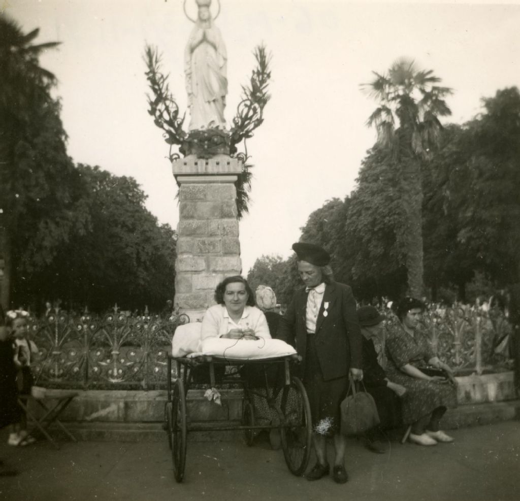 Edmée Dastan et sa mère devant la Vierge couronnée à Lourdes (France)