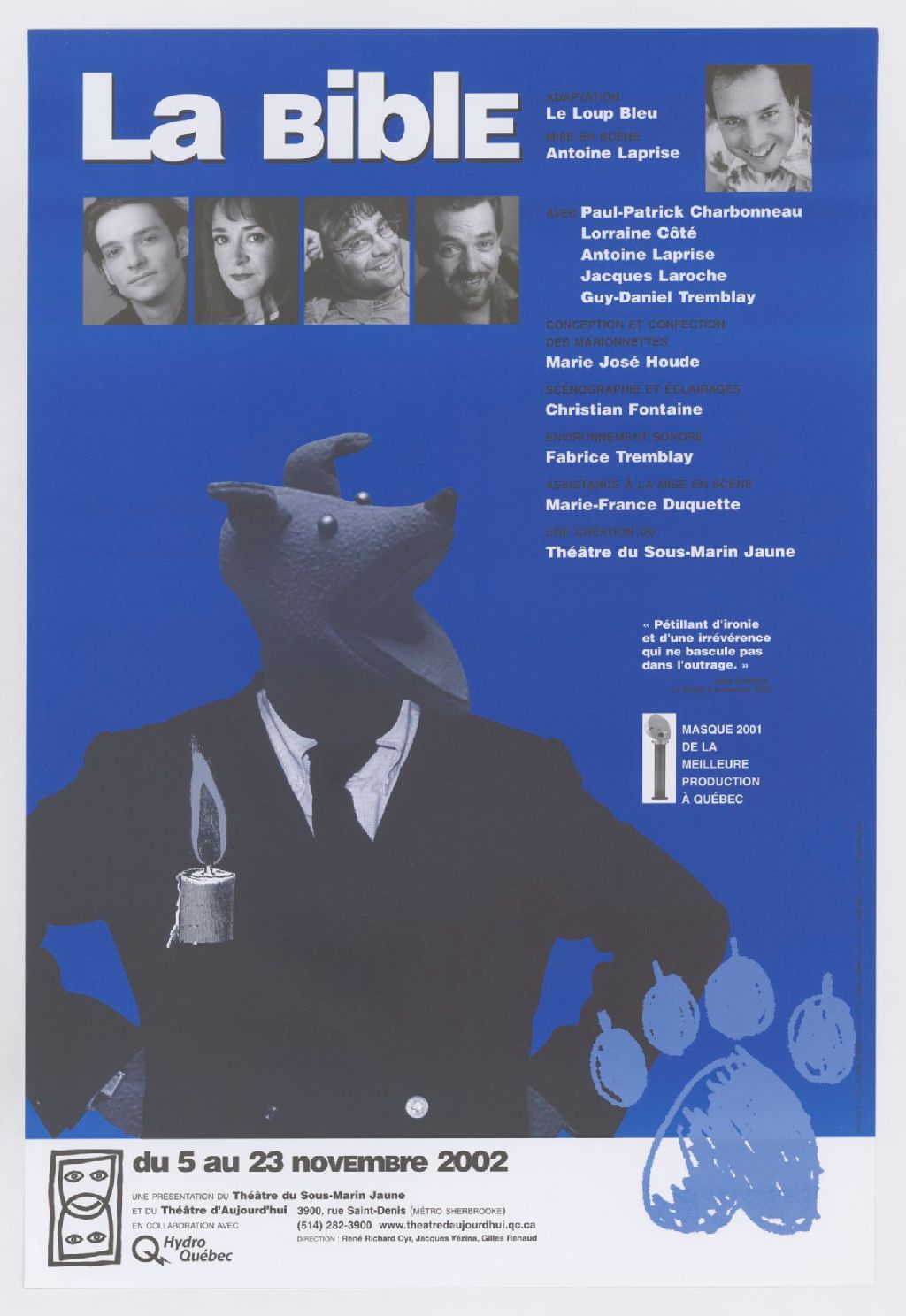 La Bible, adaptation le Loup bleu, mise en scène Antoine Laprise avec Paul-Patrick Charbonneau, Lorraine Côté ou Marie-France Laprise, Antoine Laprise ... une création du Théâtre du Sous-Marin jaune