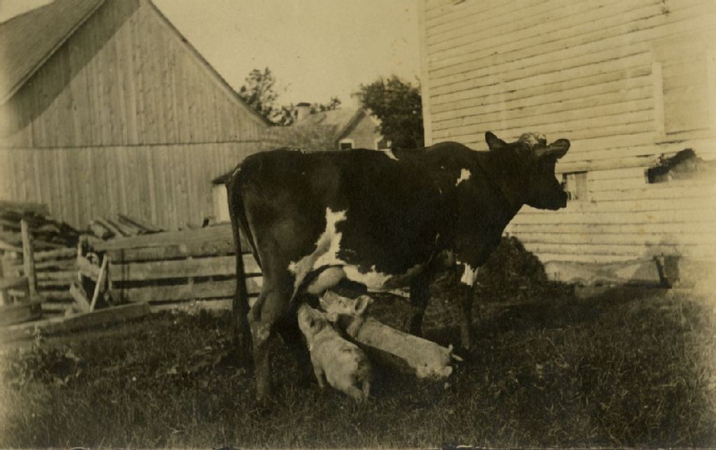 Vache donnant la tétée à des porcelets, [Vers 1900], Archives nationales à Montréal, Collection Famille Cartier-Richard, (06M,P62,D281), Photographe non identifié.