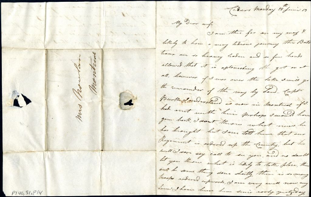 - Lettre de Maurice Nowlan, lieutenant des grenadiers du 100e régiment, Cedars, à Agathe Perrault, Montréal